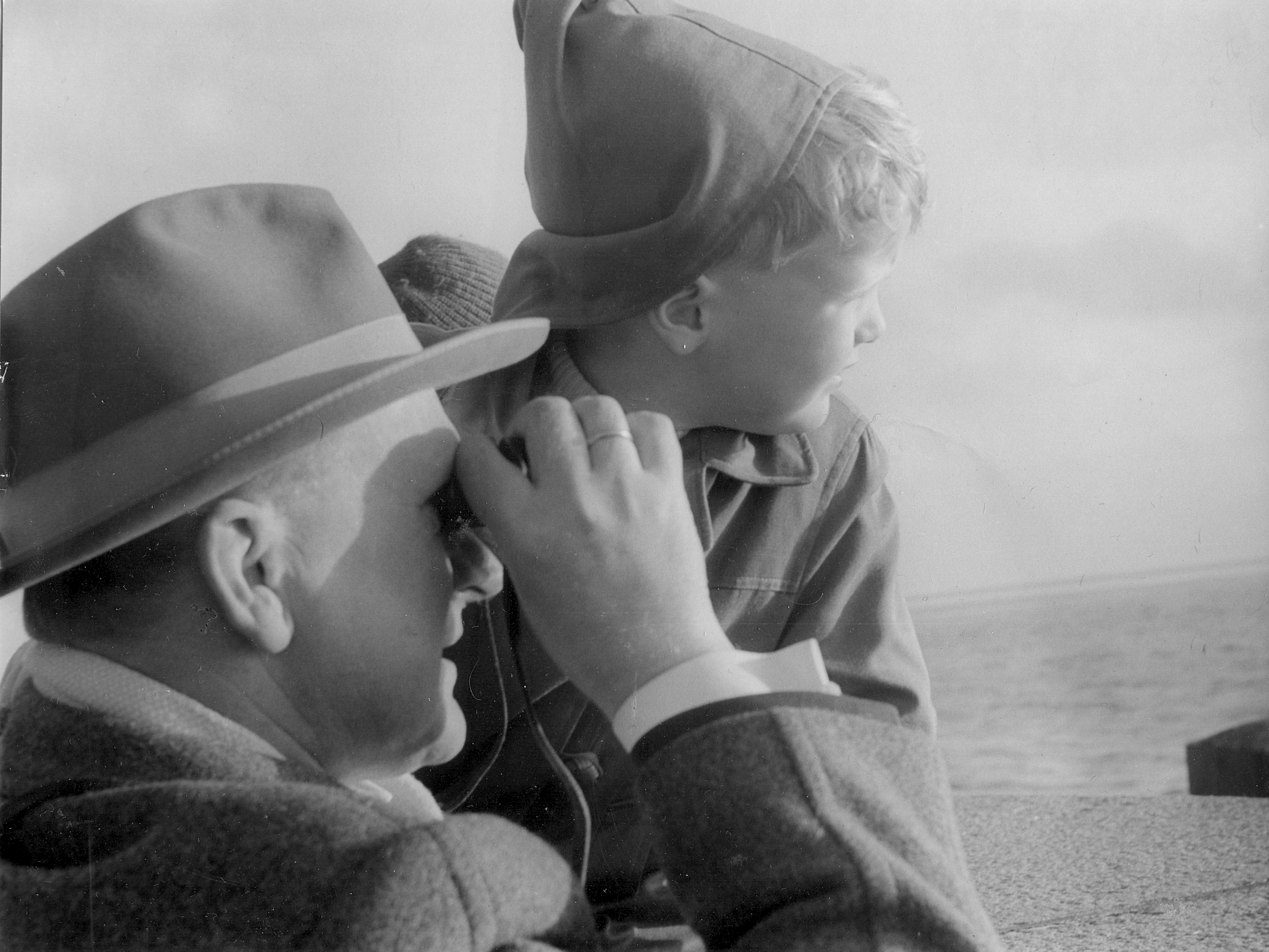 Schwarz-Weiß-Foto: Ein Emder mit seinem Sohn auf der Mole in Emden im Jahre 1960. Fotografin: I.O.